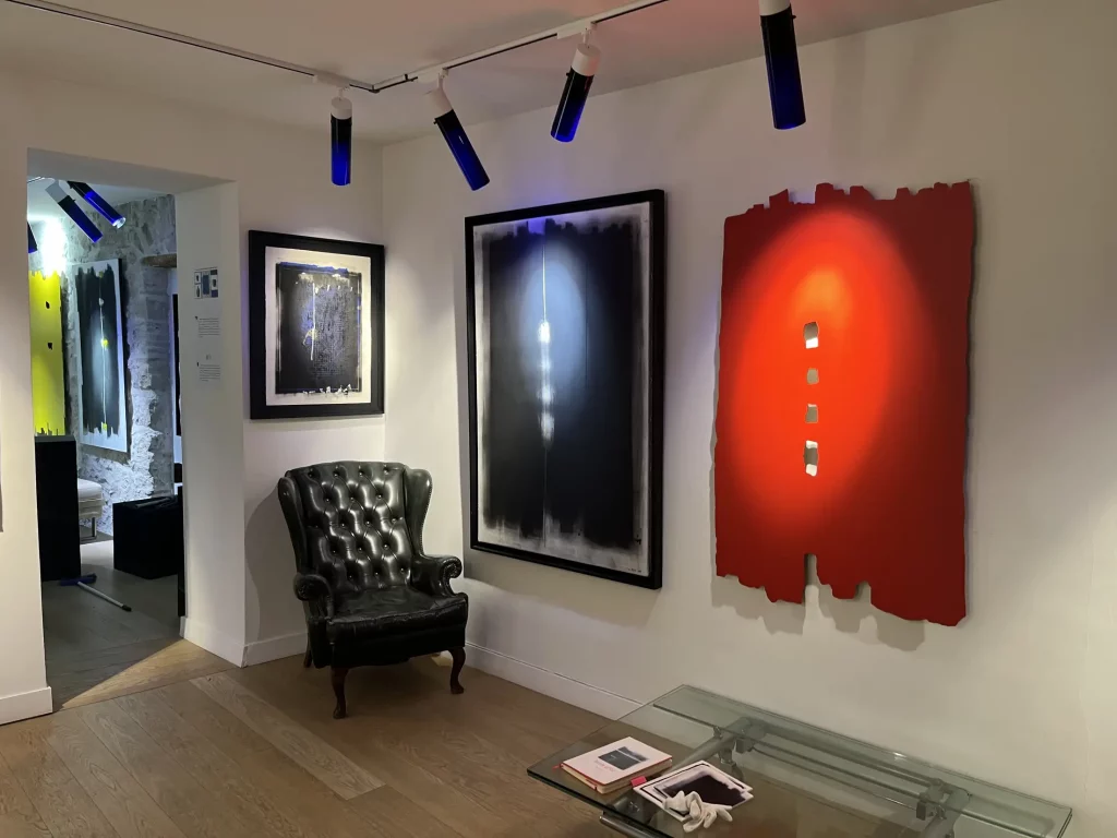 « C’est l’émotion produite par une œuvre qui reste le seul objectif » scande Gérard ALTO, convaincu du jeu qui se joue alors à trois, entre le créateur inspiré, l’œuvre présentée et le spectateur attentif. C’est l’œil curieux de l’observateur qui libère selon le point de vue, la lumière jaillissant des brèches et qui soulève, les couches superposées de noir, lestées ou allégées, pour affranchir les tons chauds, la couleur enfouie, les coulures vivaces sur le fond noir : notre regard fait partie de l’œuvre !