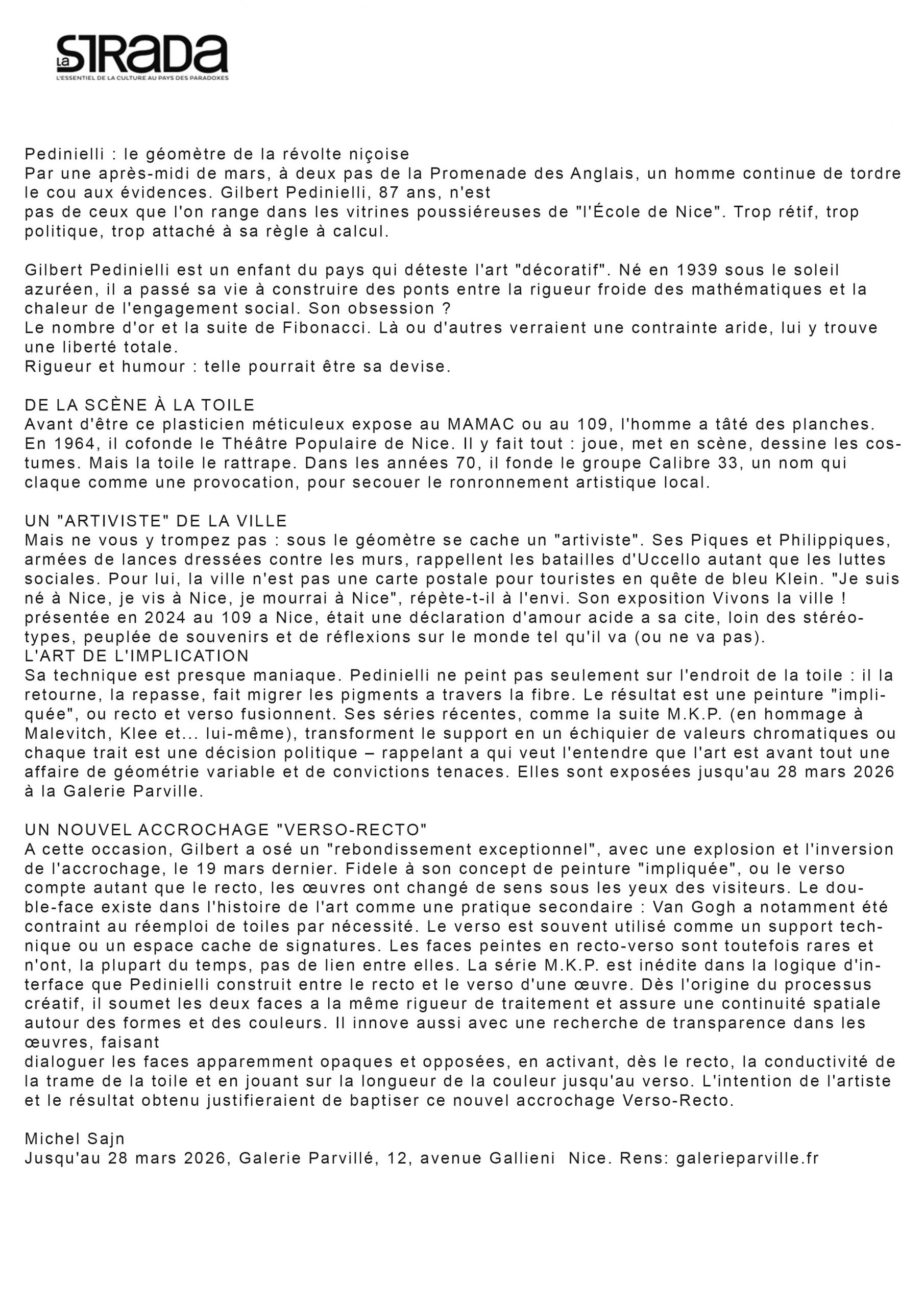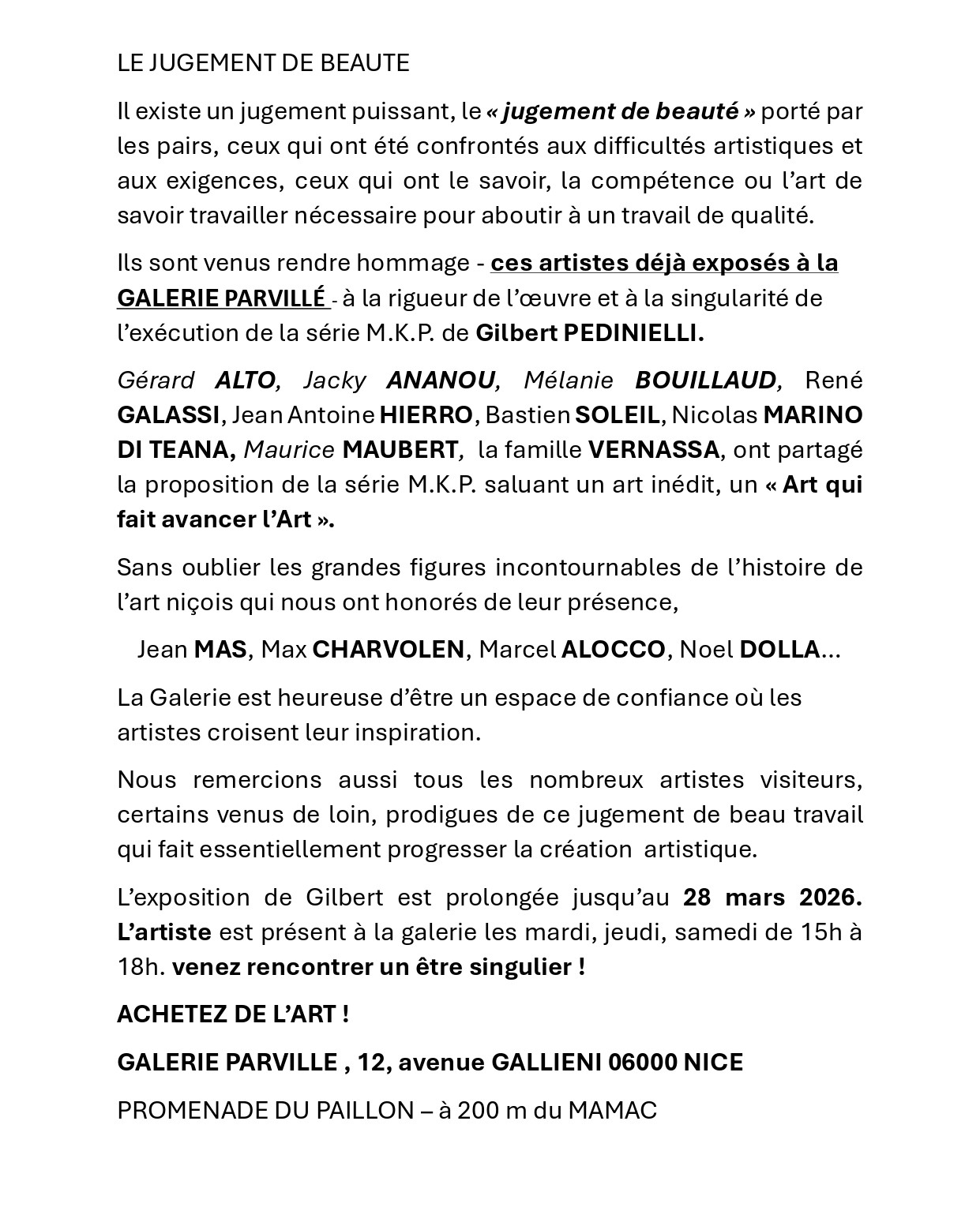 Vernissage Gilbert Pedinielli – Galerie C.Y. Parvillé, Nice — 26 février 2026