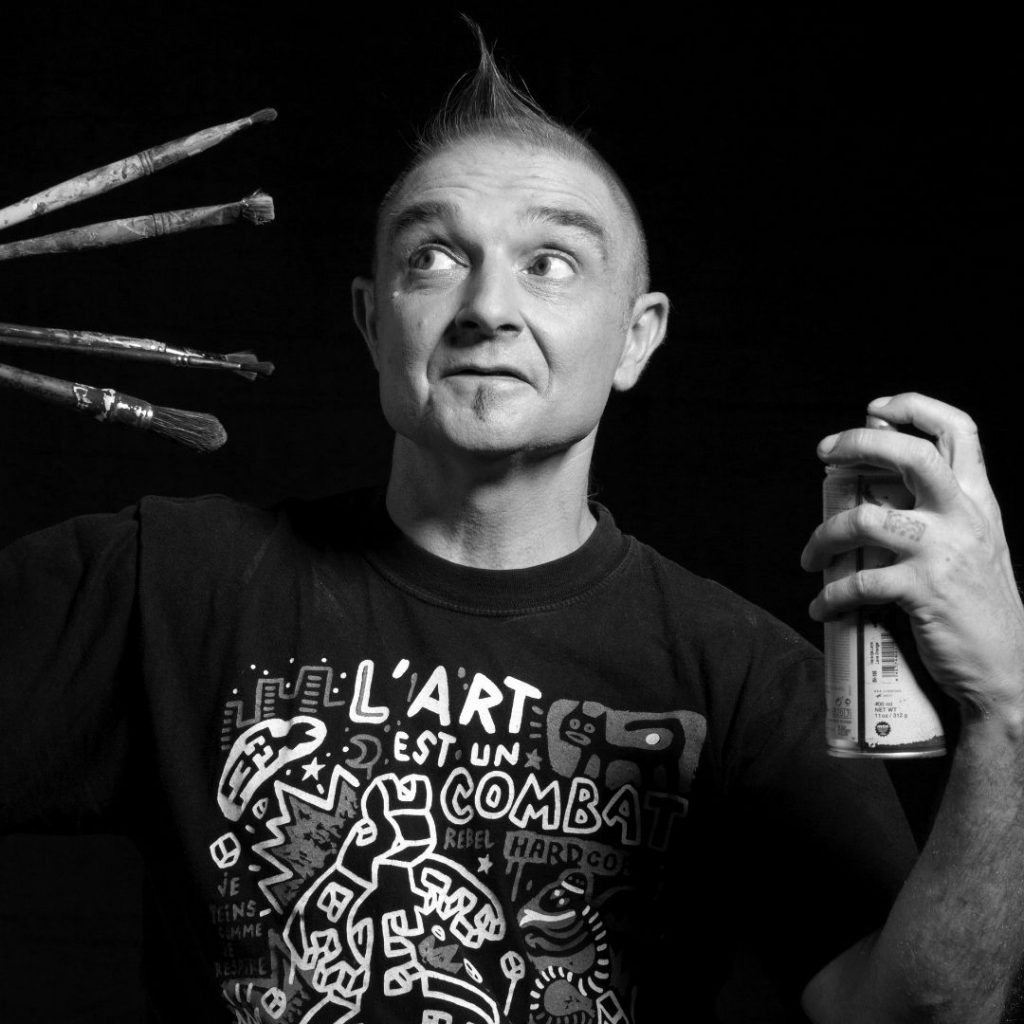 Speedy Graphito, de son vrai nom Olivier Rizzo, est un artiste français né en 1961, considéré comme un pionnier du Street Art en France. Après des études à l’école Estienne de Paris, il commence sa carrière dans les années 1980 en réalisant des graffitis dans les rues de Paris, mêlant pochoirs et peintures pour créer des personnages dynamiques et colorés. Rapidement, son travail attire l’attention et il participe à des événements majeurs du mouvement graffiti.